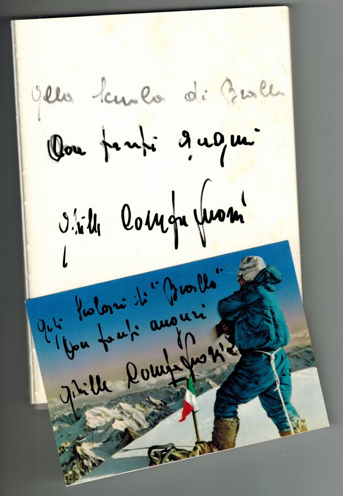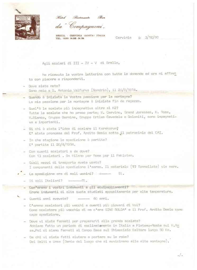 Siamo nel 1980 e mia mamma era maestra al Passo del Brallo. Approfittando di tale conoscenza fa scrivere alcune domande ai suoi alunni da inviare fino a Cervinia. Qualche tempo dopo arriva una busta indirizzata “Per gli scolari di III, IV, V di Brallo“. Conteneva un libro: “Uomini sul K2” dove lo stesso Compagnoni racconta la sua versione dell’avventura sulla vetta, nel 1954. Oltre a questo, su carta intestata dell’Hotel Ristorante Bar da Compagnoni, la risposta a tutte le domande dei ragazzi.