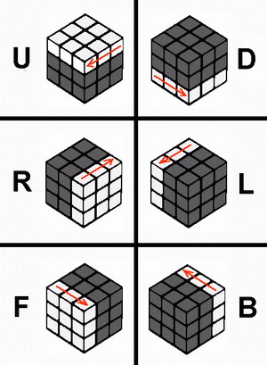Infine F sta per Front, girare in senso oraraio la faccia di fronte e B sta per Back, la faccia nascosta.