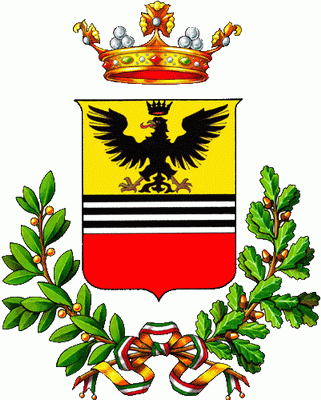 Al di sopra dello stemma campeggiava una corona turrita a cinque torri uguali, significante la presenza di fortificazioni. Nel linguaggio araldico le bande nere rappresentano la fazione ghibellina, quelle bianche, la fazione guelfa; l’aquila imperiale poggia sulla pace delle fazioni della comunità (il campo rosso).