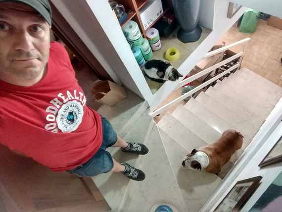 Qui vediamo una gatta europea, sul suo "balcone" mentre osserva e tiene sotto controllo un bulldog inglese che passa lì di sotto.