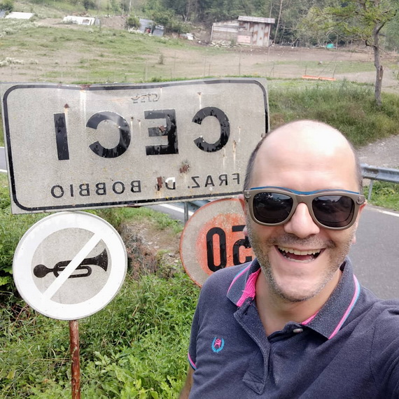 Che bello: da qui si vede il Lesima, ma si vede bene anche Cima Colletta e laggiù spicca il Penice. Scendendo raggiungo il Colle della Seppa e ovviamente giro verso Bruggi, quindi a sinistra (a destra si scende in direzione Armà). Detto così sembra che sia quasi arrivato, invece la strada strerrata è molto lunga e arzigogolata. La discesa è comunque piacevole, soprattutto una volta raggiunto il paese. La vista è incantevole: tutti i tetti di Bruggi e laggiù la chiesa. E’ singolare il fatto che sia stata costruita in fondo al paese, di solito è in centro o tuttalpiù in cima. Scendo, trovo la fontana, tante casettine carine ristrutturate bene, una vecchia insegna “commestibili” che mi fa ricordare come anche ogni piccolo paese avesse una volta delle attività.