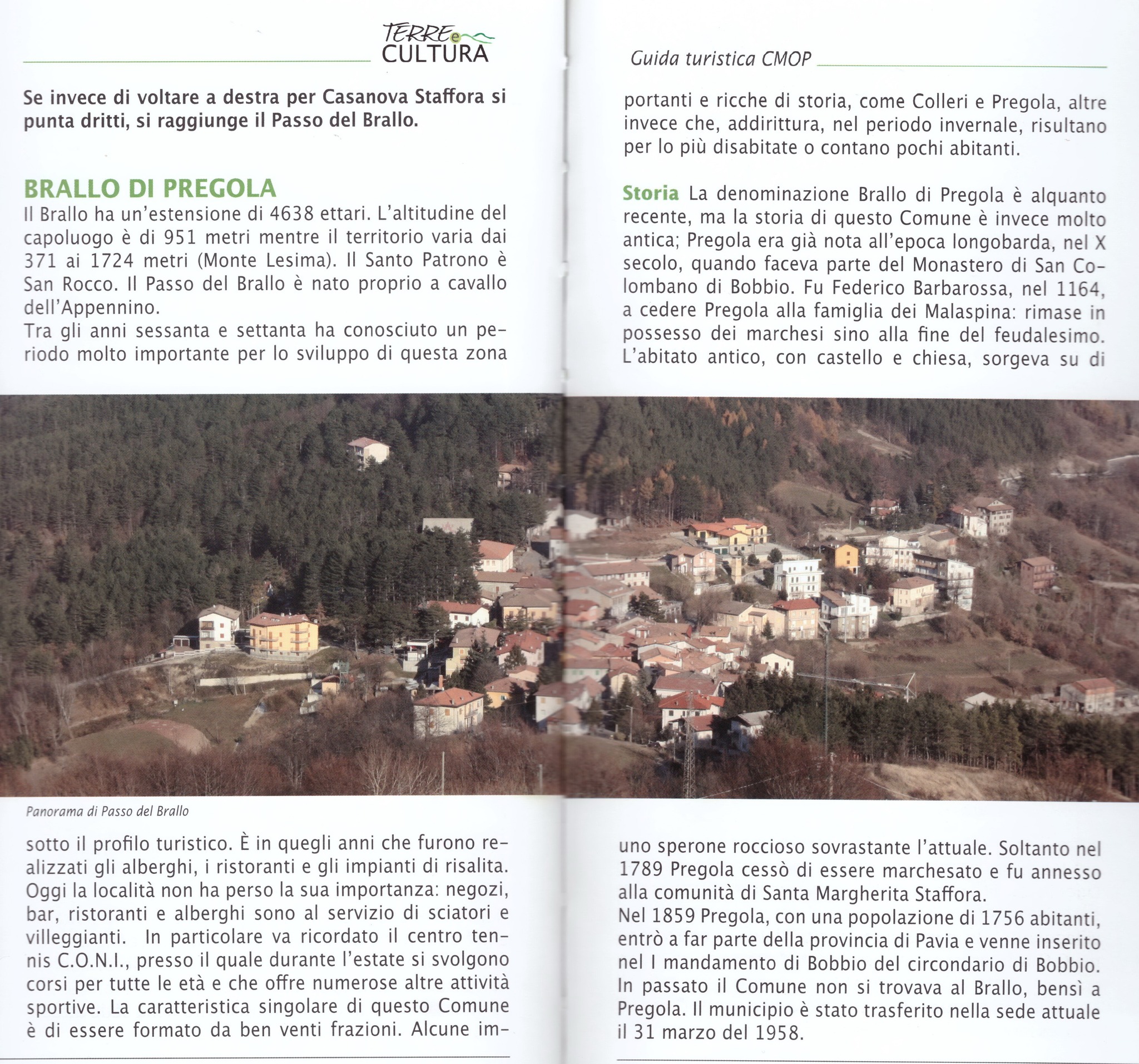 BRALLO DI PREGOLA Il Brallo ha un’estensione di 4638 ettari. L’altitudine del capoluogo è di 951 metri mentre il territorio varia dai 371 ai 1724 metri (Monte Lesima). Il Santo Patrono è San Rocco. Il Passo del Brallo è nato proprio a cavallo dell’Appennino. Tra gli anni sessanta e settanta ha conosciuto un periodo molto importante per lo sviluppo di questa zona sotto il profilo turistico. È in quegli anni che furono realizzati gli alberghi, i ristoranti e gli impianti di risalita. Oggi la località non ha perso la sua importanza: negozi, bar, ristoranti e alberghi sono al servizio di sciatori e villeggianti. In particolare va ricordato il centro tennis C.O.N.I., presso il quale durante l’estate si svolgono corsi per tutte le età e che offre numerose altre attività sportive. La caratteristica singolare di questo Comune è di essere formato da ben venti frazioni. Alcune importanti e ricche di storia, come Colleri e Pregola, altre invece che, addirittura, nel periodo invernale, risultano per lo più disabitate o contano pochi abitanti.
