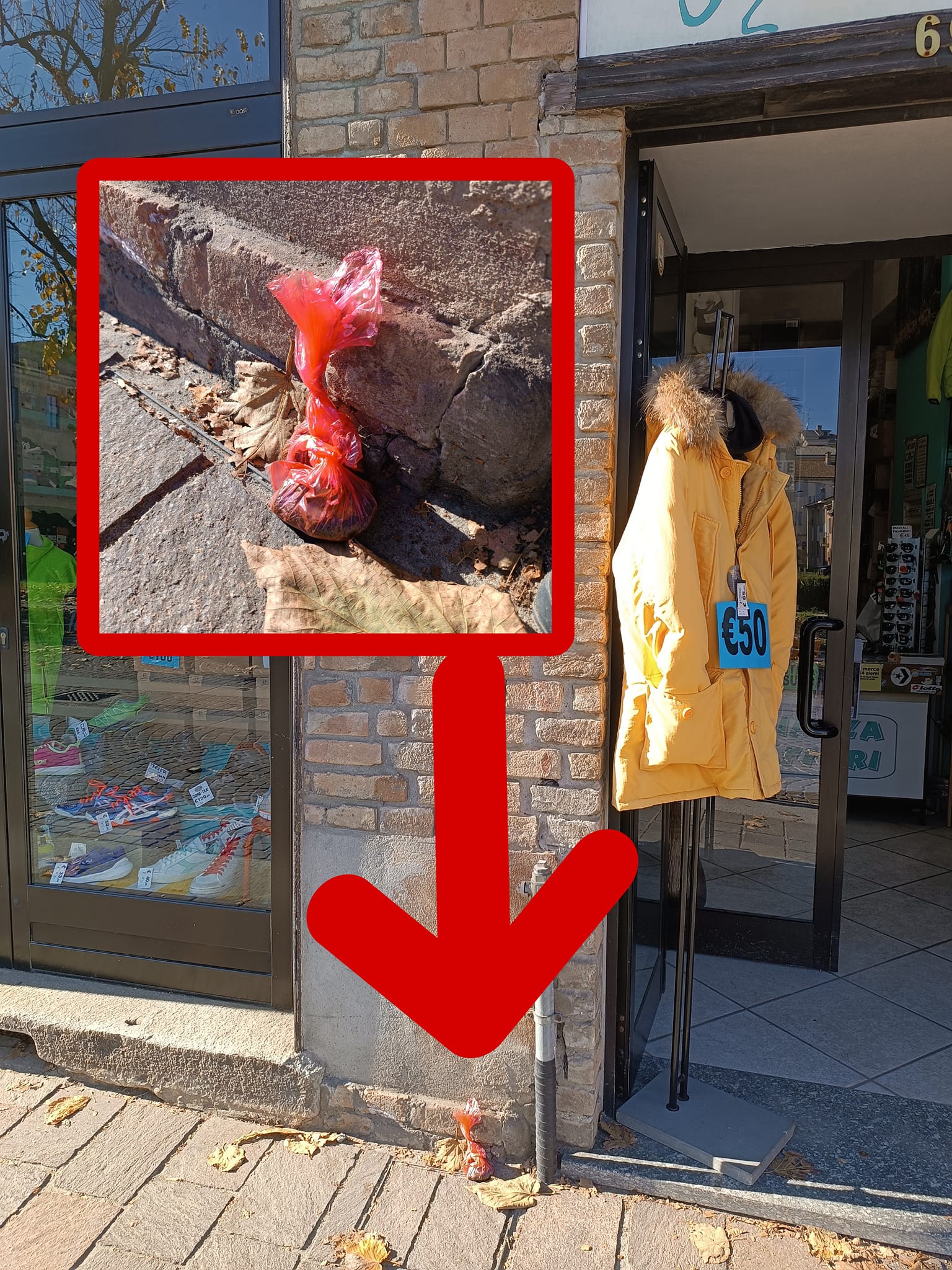 Caro padrone di cane, apprezzo il fatto che tu abbia raccolto le deiezioni del tuo amico animale, apprezzo meno il fatto che tu le abbia lasciate quasi sulla porta del mio negozio, considerando anche il fatto che a meno di 5 metri, di fronte, c’è un cestino.