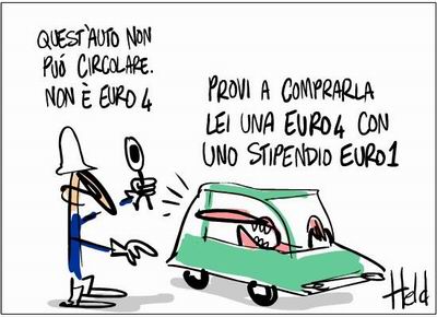 Bella questa vignetta: Se non fosse una cosa tistissima perche’ a fare le spese di questa farsa sono in prima istanza le fasce più deboli e penso agli gli anziani che girano poco (quindi complessivamente inquinano pochissimo e alla loro macchina ci sono affezionati) ci sarebbe da ridere … basta fermarsi vicino ad una pattuglia di vigili in azione ed ascoltare: in primo luogo si fanno sovente coadiuvare dagli ausiliari del traffico cosa che non mi sembra perfettamente lecita: e quello che più intristisce è il criterio col quale fermano le macchine: si passano le istruzioni … le euro 4 lasciale andare … ferma le più vecchie: col risultato che l’altra mattina davanti all’inps avevano fermato tre macchine di anziani, cosi’ li costringono a spendere quei quattro soldi che tenevano x le eventualità che tutti conoscono x comprarsi una cazzo di macchina euro 4, con o senza filtro antiparticolato, con l’unico risultato di far gonfiare vergognoasamente il mercato dell’auto alla faccia della giustizia, dell’equita’ fiscale … che schifo!