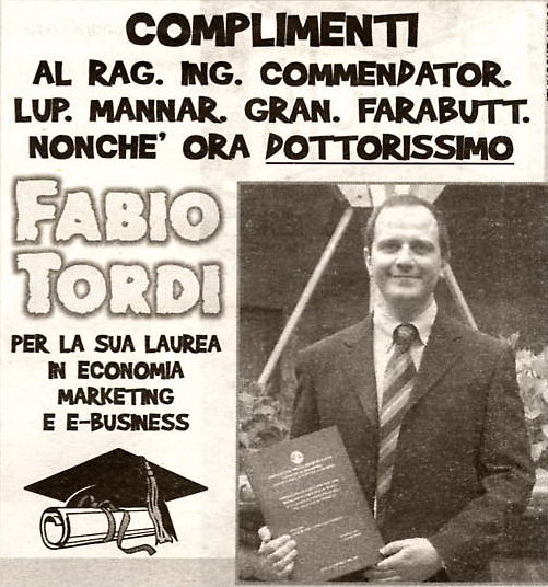 Duca Conte Barambani Serbelloni Mazzanti Viendalmare By Fabio On 3 May 2008 In Me stesso (Visto 212 volte, di cui 1 oggi)Commenti comments laurea Previous Ubriachezza (molesta) Next Nostalgia canaglia 9 Comments Add Comment → Rebecca 22:05 L’ho appena letto sul quotidiano in questione, ho preso in mano il tel. per chiamarti … poi ho pensato … l’avrà già messo sul sito; come volevasi dimostrare :-) 3 May 2008 Reply eve beh..complimenti!!! 4 May 2008 Reply ilMarti Mio Dio Fabio, dopo tanti anni sei sempre un maledetto genio! 5 May 2008 Reply Enrico Ciao fabio complimenti !!! 5 May 2008 Reply Omar complimenti ragazzaccio !!! 5 May 2008 Reply laura sei un mito!!!!! 5 May 2008 Reply debora ciao dottorisssssimo! complimenti! 6 May 2008 Reply micòl che posso di’??? sei mitticoooo!!! ps ma l’hai inviata TU alla provincia o ti hannno fatto uno scherzone? GRAN MAESTRO DELL?ANNO!!! 7 May 2008 Reply Fabio Grazie a tutti….. 8 May 2008 Reply Leave a Reply Cancel replyYour email address will not be published. Required fields are marked *Comment * Name * Email * Website Δ