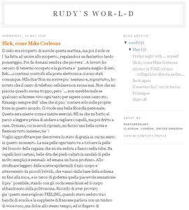 Volevo segnalarvi questo blog di un mio amico che vive a Clapham. L’ha appena aperto, quindi non c’è ancora molto, ma mi piace molto la sua impostazione. E’ un diario di quello che succede ogni giorno. Perchè mi piace? Perchè, come amo fare anche io, riporta a grandi linee i fatti principali, ma si sofferma tanto sui particolari e sulle riflessioni. E poi è uno che ama le donne… per il fatto di essere donne. Come me adora la femminilità, che traspare talvolta anche dagli atteggiamenti più inconseueti delle protagoniste dell’altra metà del cielo. Buona fortuna, amico mio.