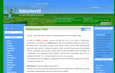 Quasi 4 mesi fa, in questo articolo vi dicevo che avrei aggiustato la grafica del sito, in modo da essere visualizzata bene da tutti i computer. Purtroppo non ce l’ho fatta, e mi sono dovuto arrendere a usarne un’altra. La scelta è caduta su quella che da oggi vedrete su questo sito: sfondo verde, due barre azzurre laterali (un po’ berlusconiane direbbe qualcuno) e il mio solito omino che salta. Ovviamente è ancora da perfezionare, dovrò rimettere la Tag Cloud e gli ultimi commenti inseriti (sarebbe bella anche una classifica dei post più letti…).