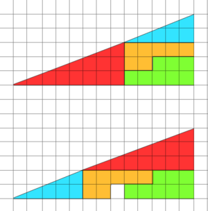 (Ora guardate la figura: il prima triangolo è composta da 4 figure, le stesse identiche del secondo triangolo. E allora come è possibile che ci sia un qudratino in più? La risposta la trovate qui)