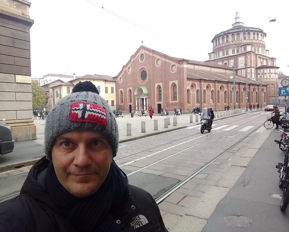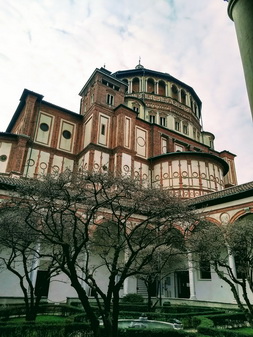 Sulla sinistra ci sarà la fila per vedere il Cenacolo di Leonardo (io ahimè non l'ho ancora visto), davanti a voi questa chiesa serena, ariosa, alta, luminosa, con una facciata bianca e rossa tipicamente lombarda. Ludovico il Moro la voleva come mausoleo di famiglia, così affido a Donato Bramante il compito di buttar giù la chiesa che qui si stava costruendo e ricominciare da zero. Bramante non la buttò giù del tutto, mentre Ludovico Maria Sforza (detto il Moro) fu deposto e la chiesa rimase così, un po' gotica e un po' rinascimentale. Durante la seconda guerra mondiale fu bombardata e poi restaurata.