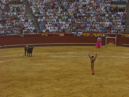A metà pomeriggio smettiamo di drogarci di raggi UVA e raggiungiamo la Plaza de Toros per assistere alla corrida. È una di quelle cose, se sei in Spagna, e specialmente in una città come Valencia, a cui vale la pena assistere. Lo spettacolo in sé è una gran pirlata, nel senso che è uno sport (o similare) veramente assurdo: alcuni uomini torturano un povero e stupido animale, finché arriva il matador e lo finisce. Lo spettacolo sta tutto nella teatralità. Per la carità, si potrebbe obiettare che gli stessi spagnoli hanno appena vinto la coppa del mondo in uno sport dove 22 uomini in mutande corrono dietro a una palla, ma almeno lì c’è poco di cruento e non si sa mai come va a finire, qui il risultato è scontato. Gli altri spettatori, turisti a parte, erano di ben altro avviso e si emozionavano parecchio; probabilmente siamo noi inesperti che non capivamo appieno i gesti. Resta il fatto che io un bambino non ce lo porterei di certo, può fare una brutta impressione vedere quei molossi punzecchiati sulla nuca che perdono litri di sangue… Funziona essenzialmente così: entra il toro, una mezza dozzina di matador di basso livello lo sfiancano facendolo correre qua e la, poi altri matador più alti in grado iniziano a piantagli in corpo delle picche infine arriva il fenomeno e lo finisce. Non subito, ci mette un buon venti minuti di saltelli. Gente che ha fegato, indubbiamente, ma il confronto è chiaramente impari. E poi, onestamente, a veder seccare un animale non mi importa così tanto. Però è folkloristico.